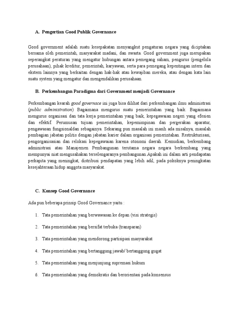 Istilah good governance di indonesia dipahami sebagai kinerja suatu pemerintahan, perusahaan atau organisasi kemasyarakatan. Dalam bahasa inggris good governance adalah serangkaian proses yang berlaku untuk kedua organisasi sektor publik dan swasta untuk menentukan keputusan. Penekanan konsep good governance menurut agere 2000 adalah pada prinsip. Good governance (tata pemerintahan yang baik), good government (pemerintahan yang baik), dan clean governance (pemerintahan yang bersih). 16 bab ii kajian teori a. Pengertian clean and good governance terminologi good governance dalam bahasa dan pemahaman masyarakat termasuk di sebagian elit politik, sering rancu. Apakah gcg bisa dijadikan patokan bahwa perusahaan sudah taat membayar pajak ? Akhirnya perusahaan tersebut harus menuai suatu kehancuran yang tragis dengan meninggalkan hutang milyaran dolar dan menyisakan implikasi negatif bagi. Kuisioner / untuk pertanyaan item pertanyaan good. Permasalahan good governance di indonesia pun tidak luput dari perhatian masyarakat. Detail soal dan jawaban tentang good governance pdf dapat kamu nikmati dengan cara klik link download dibawah dengan mudah tanpa adanya iklan yang mengganggu. Kali ini akan membahas mengenai good governance. Pengertian prinsip karakteristik asas dan aspek terlengkap.